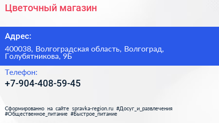 Цветочный магазин по адресу 400038, Волгоградская область, Волгоград, Голубятникова, 9Б в дальнейшем Организация, размещена в следующих категориях: