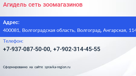 Агидель, сеть зоомагазинов по адресу 400081, Волгоградская область, Волгоград, Ангарская, 114 в дальнейшем Организация, размещена в следующих категориях: