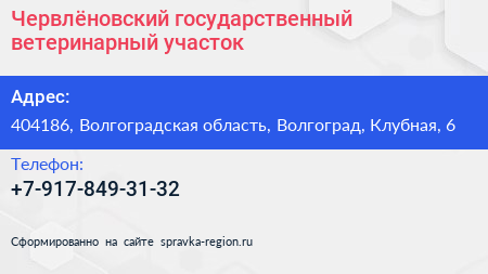 Червлёновский государственный ветеринарный участок по адресу 404186, Волгоградская область, Волгоград, Клубная, 6 в дальнейшем Организация, размещена в следующих категориях: