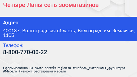Четыре Лапы, сеть зоомагазинов по адресу 400137, Волгоградская область, Волгоград, им. Землячки, 110Б в дальнейшем Организация, размещена в следующих категориях: