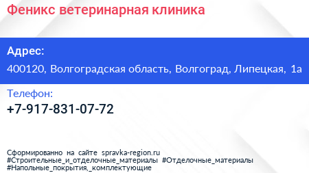 Феникс, ветеринарная клиника по адресу 400120, Волгоградская область, Волгоград, Липецкая, 1а в дальнейшем Организация, размещена в следующих категориях: