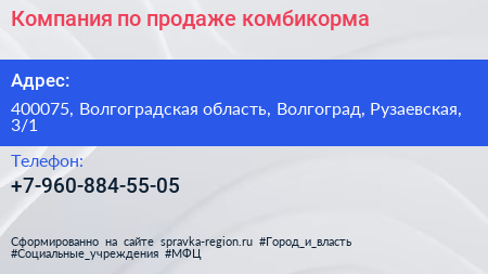 Компания по продаже комбикорма по адресу 400075, Волгоградская область, Волгоград, Рузаевская, 3/1 в дальнейшем Организация, размещена в следующих категориях:
