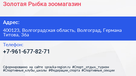 Золотая Рыбка, зоомагазин по адресу 400123, Волгоградская область, Волгоград, Германа Титова, 36а в дальнейшем Организация, размещена в следующих категориях: