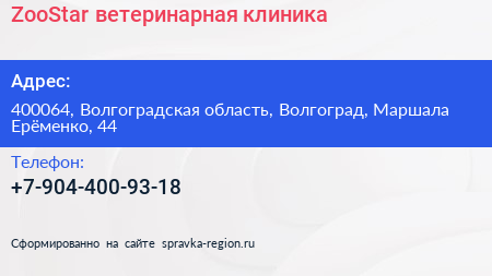 ZooStar, ветеринарная клиника по адресу 400064, Волгоградская область, Волгоград, Маршала Ерёменко, 44 в дальнейшем Организация, размещена в следующих категориях: