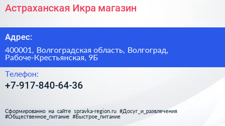 Астраханская Икра, магазин по адресу 400001, Волгоградская область, Волгоград, Рабоче-Крестьянская, 9Б в дальнейшем Организация, размещена в следующих категориях: