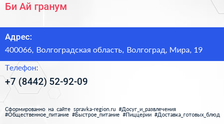 Би-Ай гранум по адресу 400066, Волгоградская область, Волгоград, Мира, 19 в дальнейшем Организация, размещена в следующих категориях: