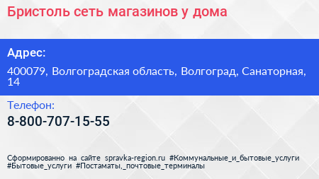 Бристоль, сеть магазинов у дома по адресу 400079, Волгоградская область, Волгоград, Санаторная, 14 в дальнейшем Организация, размещена в следующих категориях: