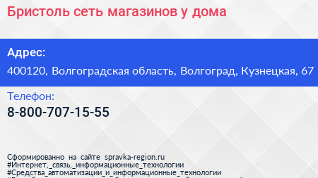 Бристоль, сеть магазинов у дома по адресу 400120, Волгоградская область, Волгоград, Кузнецкая, 67 в дальнейшем Организация, размещена в следующих категориях: