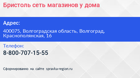 Бристоль, сеть магазинов у дома по адресу 400075, Волгоградская область, Волгоград, Краснополянская, 16 в дальнейшем Организация, размещена в следующих категориях: