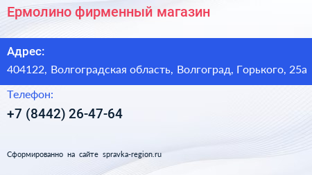 Ермолино, фирменный магазин по адресу 404122, Волгоградская область, Волгоград, Горького, 25а в дальнейшем Организация, размещена в следующих категориях: