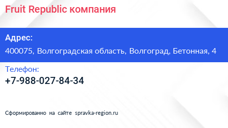 Fruit Republic, компания по адресу 400075, Волгоградская область, Волгоград, Бетонная, 4 в дальнейшем Организация, размещена в следующих категориях:
