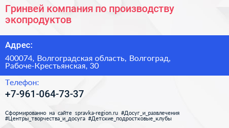 Гринвей, компания по производству экопродуктов по адресу 400074, Волгоградская область, Волгоград, Рабоче-Крестьянская, 30 в дальнейшем Организация, размещена в следующих категориях: