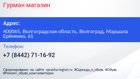Гурман, магазин по адресу 400065, Волгоградская область, Волгоград, Маршала Ерёменко, 61 в дальнейшем Организация, размещена в следующих категориях: