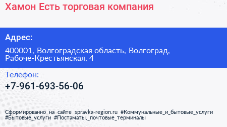 Хамон Есть, торговая компания по адресу 400001, Волгоградская область, Волгоград, Рабоче-Крестьянская, 4 в дальнейшем Организация, размещена в следующих категориях: