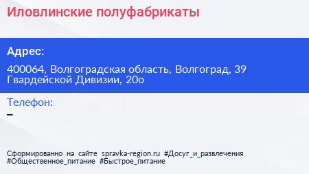 Иловлинские полуфабрикаты по адресу 400064, Волгоградская область, Волгоград, 39 Гвардейской Дивизии, 20о в дальнейшем Организация, размещена в следующих категориях: