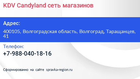 KDV Candyland, сеть магазинов по адресу 400105, Волгоградская область, Волгоград, Таращанцев, 41 в дальнейшем Организация, размещена в следующих категориях: