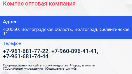 Компас, оптовая компания по адресу 400050, Волгоградская область, Волгоград, Селенгинская, 11 в дальнейшем Организация, размещена в следующих категориях: