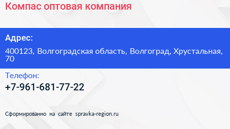 Компас, оптовая компания по адресу 400123, Волгоградская область, Волгоград, Хрустальная, 70 в дальнейшем Организация, размещена в следующих категориях: