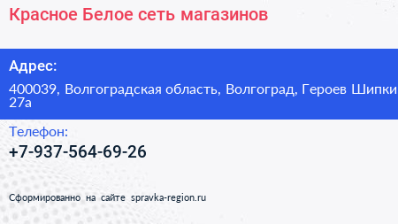 Красное & Белое, сеть магазинов по адресу 400039, Волгоградская область, Волгоград, Героев Шипки, 27а в дальнейшем Организация, размещена в следующих категориях: