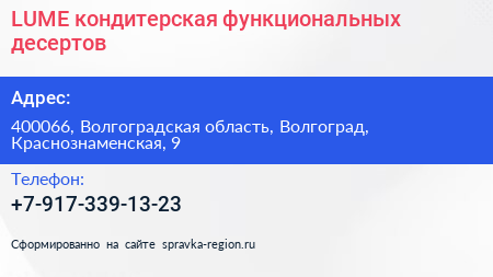 LUME, кондитерская функциональных десертов по адресу 400066, Волгоградская область, Волгоград, Краснознаменская, 9 в дальнейшем Организация, размещена в следующих категориях: