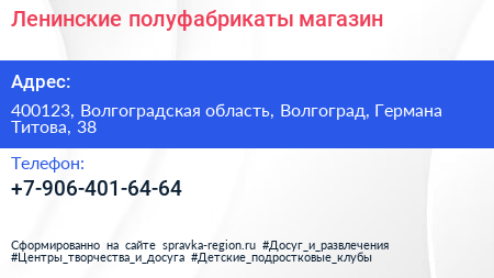 Ленинские полуфабрикаты, магазин по адресу 400123, Волгоградская область, Волгоград, Германа Титова, 38 в дальнейшем Организация, размещена в следующих категориях: