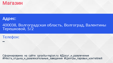 Магазин по адресу 400038, Волгоградская область, Волгоград, Валентины Терешковой, 5/2 в дальнейшем Организация, размещена в следующих категориях:
