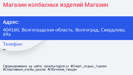 Магазин колбасных изделий, Магазин по адресу 404160, Волгоградская область, Волгоград, Свердлова, 69а в дальнейшем Организация, размещена в следующих категориях:
