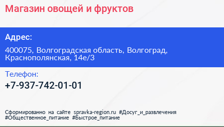Магазин овощей и фруктов по адресу 400075, Волгоградская область, Волгоград, Краснополянская, 14е/3 в дальнейшем Организация, размещена в следующих категориях: