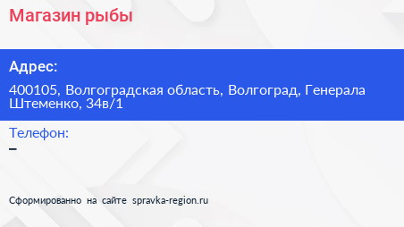 Магазин рыбы по адресу 400105, Волгоградская область, Волгоград, Генерала Штеменко, 34в/1 в дальнейшем Организация, размещена в следующих категориях: