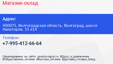 Магазин-склад по адресу 400075, Волгоградская область, Волгоград, шоссе Авиаторов, 15 к14 в дальнейшем Организация, размещена в следующих категориях: