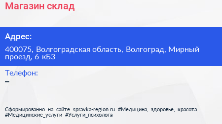 Магазин-склад по адресу 400075, Волгоградская область, Волгоград, Мирный проезд, 6 кБ3 в дальнейшем Организация, размещена в следующих категориях: