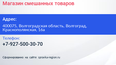 Магазин смешанных товаров по адресу 400075, Волгоградская область, Волгоград, Краснополянская, 16а в дальнейшем Организация, размещена в следующих категориях: