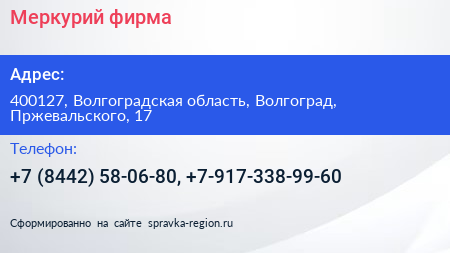 Меркурий, фирма по адресу 400127, Волгоградская область, Волгоград, Пржевальского, 17 в дальнейшем Организация, размещена в следующих категориях: