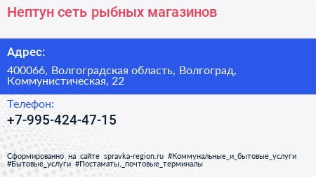 Нептун, сеть рыбных магазинов по адресу 400066, Волгоградская область, Волгоград, Коммунистическая, 22 в дальнейшем Организация, размещена в следующих категориях: