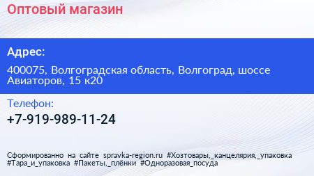 Оптовый магазин по адресу 400075, Волгоградская область, Волгоград, шоссе Авиаторов, 15 к20 в дальнейшем Организация, размещена в следующих категориях: