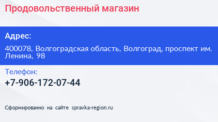 Продовольственный магазин по адресу 400078, Волгоградская область, Волгоград, проспект им. Ленина, 98 в дальнейшем Организация, размещена в следующих категориях: