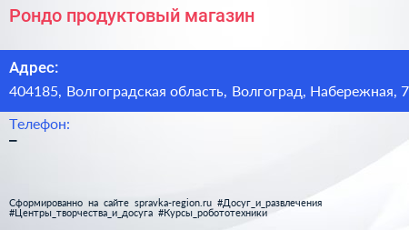 Рондо, продуктовый магазин по адресу 404185, Волгоградская область, Волгоград, Набережная, 7 в дальнейшем Организация, размещена в следующих категориях:
