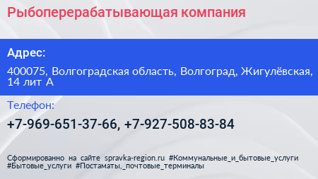 Рыбоперерабатывающая компания по адресу 400075, Волгоградская область, Волгоград, Жигулёвская, 14 лит А в дальнейшем Организация, размещена в следующих категориях: