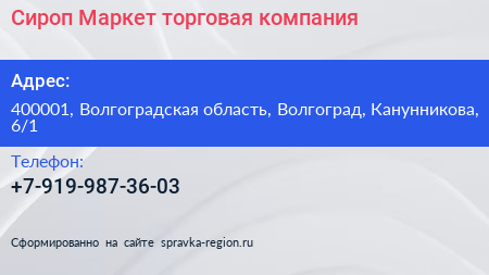 Сироп Маркет, торговая компания по адресу 400001, Волгоградская область, Волгоград, Канунникова, 6/1 в дальнейшем Организация, размещена в следующих категориях: