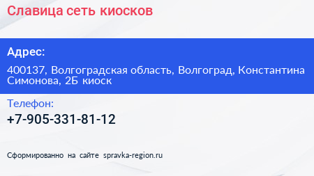 Славица, сеть киосков по адресу 400137, Волгоградская область, Волгоград, Константина Симонова, 2Б киоск в дальнейшем Организация, размещена в следующих категориях: