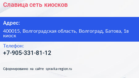 Славица, сеть киосков по адресу 400015, Волгоградская область, Волгоград, Батова, 1в киоск в дальнейшем Организация, размещена в следующих категориях: