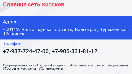 Славица, сеть киосков по адресу 400119, Волгоградская область, Волгоград, Туркменская, 17в киоск в дальнейшем Организация, размещена в следующих категориях: