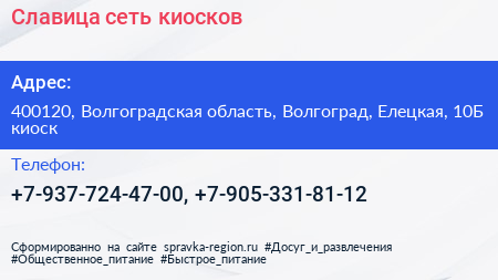 Славица, сеть киосков по адресу 400120, Волгоградская область, Волгоград, Елецкая, 10Б киоск в дальнейшем Организация, размещена в следующих категориях: