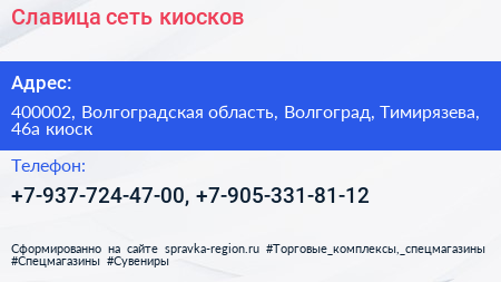 Славица, сеть киосков по адресу 400002, Волгоградская область, Волгоград, Тимирязева, 46а киоск в дальнейшем Организация, размещена в следующих категориях:
