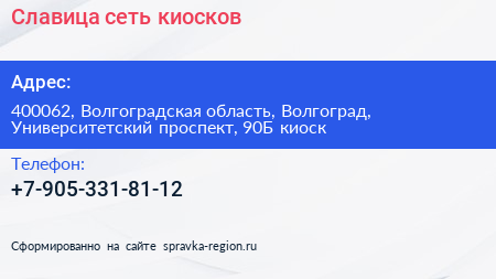 Славица, сеть киосков по адресу 400062, Волгоградская область, Волгоград, Университетский проспект, 90Б киоск в дальнейшем Организация, размещена в следующих категориях: