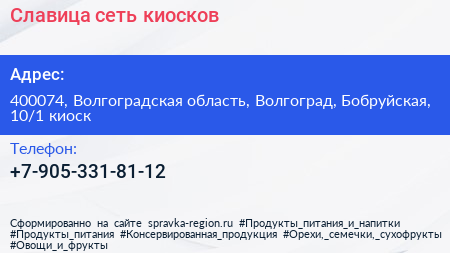 Славица, сеть киосков по адресу 400074, Волгоградская область, Волгоград, Бобруйская, 10/1 киоск в дальнейшем Организация, размещена в следующих категориях: