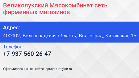 Великолукский Мясокомбинат, сеть фирменных магазинов по адресу 400002, Волгоградская область, Волгоград, Казахская, 16з в дальнейшем Организация, размещена в следующих категориях: