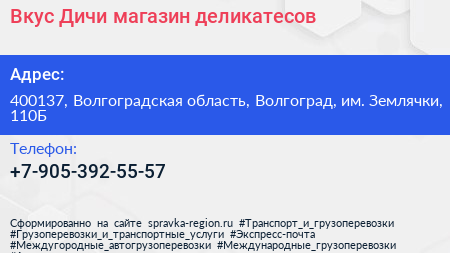 Вкус Дичи, магазин деликатесов по адресу 400137, Волгоградская область, Волгоград, им. Землячки, 110Б в дальнейшем Организация, размещена в следующих категориях: