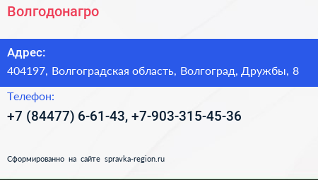 Волгодонагро по адресу 404197, Волгоградская область, Волгоград, Дружбы, 8 в дальнейшем Организация, размещена в следующих категориях: