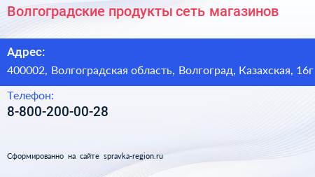 Волгоградские продукты, сеть магазинов по адресу 400002, Волгоградская область, Волгоград, Казахская, 16г в дальнейшем Организация, размещена в следующих категориях: